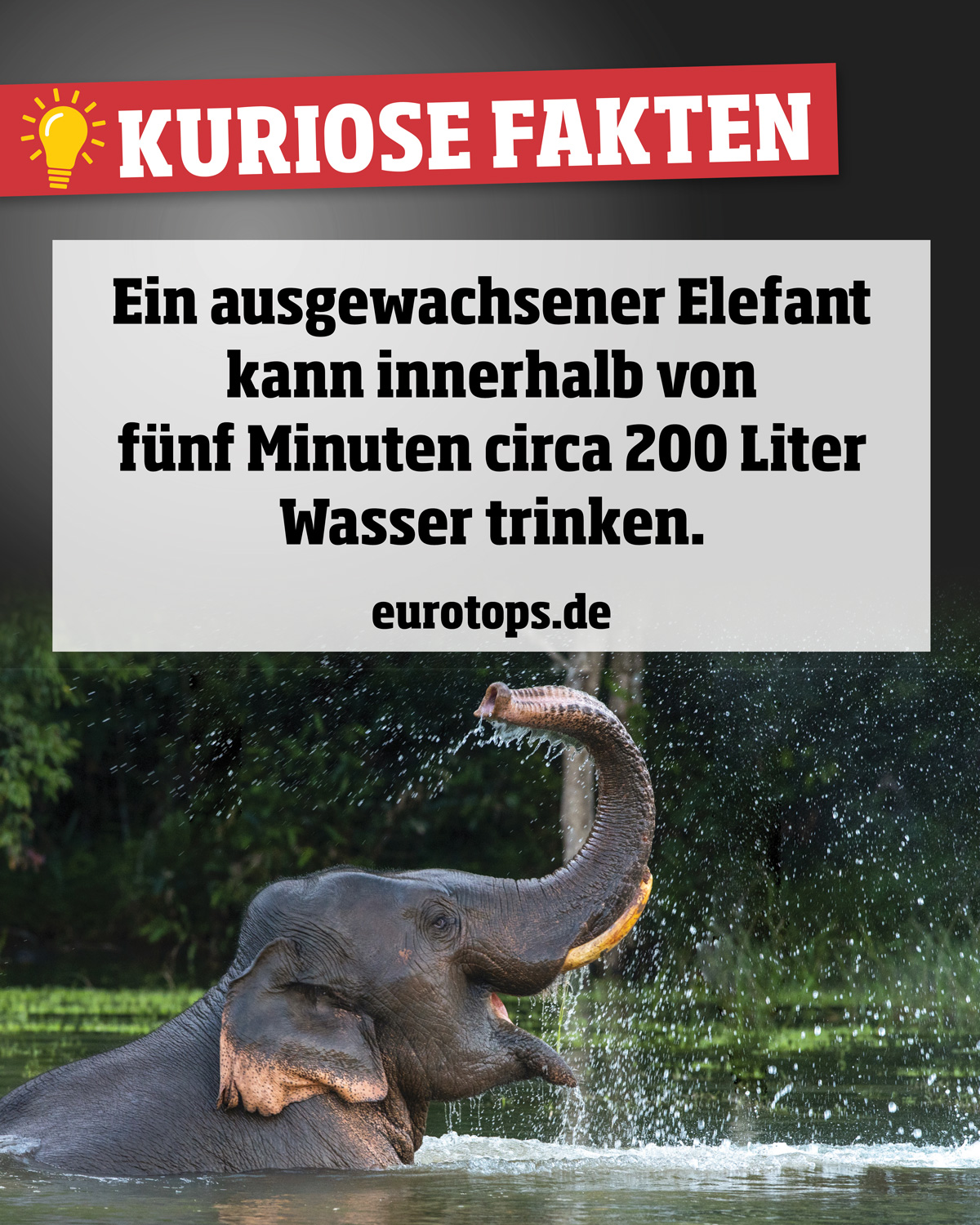 In den Rüssel eines ausgewachsenen Elefanten passen 8-10 Liter Wasser. Auch wenn es oft vermutet wird, so können sie nicht durch diesen trinken. Den Rüssel nutzen Elefanten nur zum Aufsaugen von Flüssigkeit. Dabei saugen sie das Wasser mit bis zu 540 km/h an.