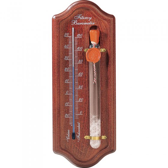 Es ist so geheimnisvoll wie faszinierend: der Vorläufer des ADMIRAL FITZROY STURMGLASBAROMETERS wurde schon im 19 Jahrhundert von dem gleichnamigen englischen Meteorologen erfunden, gibt der Wissenschaft aber noch heute Rätsel auf! Im mit Alkohol und Kampfer gefüllten Glas wachsen je nach Luftdruck und Temperatur verschiedene Kristallstrukturen. Bleibt das Wetter schön oder drohen Gewitter? Darüber können Ihnen die Kristalle Auskunft geben – doch die genaue Funktionsweise ist noch immer nicht bekannt! Das Glas ist zusammen mit einem Thermometer auf einer edlen Buchenholzplatte mit Mahagoni-Finish befestigt und schmückt so jede Wand. Maße (B x H): ca. 12 x 32 cm. Ein Klassiker der Meteorologie!