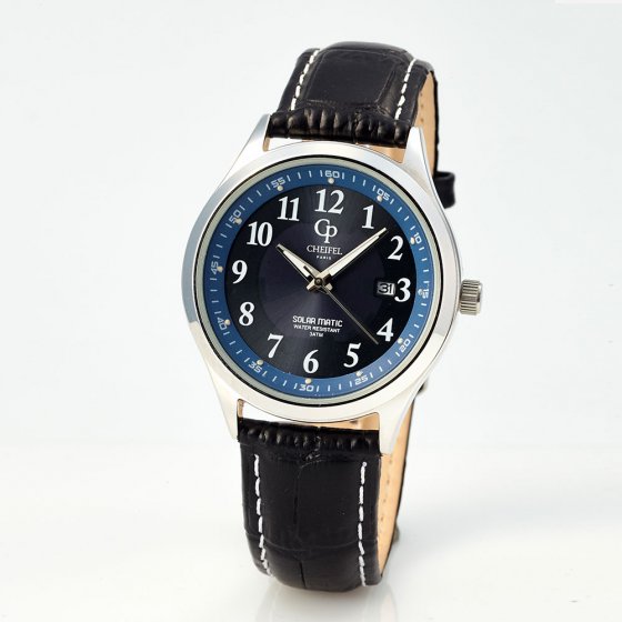 Das dunkelblaue Zifferblatt dieser Uhr sieht nicht nur edel aus, es birgt auch ein Geheimnis: Darunter liegt ein Solar-Panel, dass das Seiko-Epson-Quarzuhrwerk mit Strom versorgt! Dank eines integrieren Hochleistungsakkus beträgt die Dunkelgangreserve der ARMBANDUHR „SOLAR MATIC“ nach intensiver Sonneneinstrahlung bis zu 4 Monate – ein Funktionsausfall ist also selbst in sonnenarmen Wintermonaten nicht zu befürchten, die Uhr ist ein absolut zuverlässiger Zeitmesser. Ihr kerniges Lederarmband mit gesteppten Nähten unterstreicht die maskuline Optik. Maße: Ø ca. 39 mm, Gehäusestärke ca. 10 mm. Hochpräzise Zeitanzeige, clevere Technik, tolle Optik – was kann man von einer Männeruhr mehr erwarten?