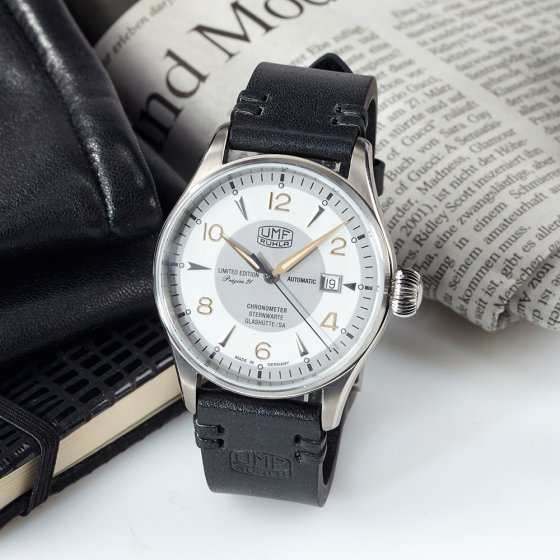 Ganggenauigkeit ist das ultimative Qualitätskriterium für eine Automatikuhr. Der AUTOMATIK-CHRONOMETER „PRÄZISA 21“ ist da über jeden Zweifel erhaben, denn er wurde von der deutschen behördlichen Prüfstelle in der Sternwarte Glashütte S. A. offiziell als Chronometer zertifiziert. Sein zweifarbiges Zifferblatt erinnert an die „Präzisa“-Urversion, die von 1948 bis 1963 im Handel war. Das Gehäuse besteht aus einer antimagnetischen Titan- Legierung. Eine speziell verbaute Glucydur Unruh in dem Automatik-Uhrwerk ermöglicht höchste Präzision und Ganggenauigkeit mit sehr niedrigem Wärmeausdehnungskoeffizienten. Das Armband ist aus handgenähtem Kalbsleder. Maße: Ø ca. 42 mm, Gehäusestärke ca. 11 mm. Mechanisch angetrieben, geschichtsträchtig und extrem präzise – diese Kombination ist selbst im Luxusuhrensegment selten!