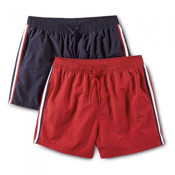 Ob Badesee, Gartenpool oder Meer: Was ist schöner, als an heißen Tagen ins kühle Nass zu tauchen! Da fehlen nur noch diese Badeshorts für Ihr Glück. Leicht und angenehm zu tragen, trocknen die nach dem Baden im Nu. Sehr clever sind die Schubtaschen mit Mesh-Futter und die Tasche hinten mit Klettpatte und Wasserablauf-Öse. Die Badeshorts kommen mit Mesh-Innenslip für den guten Halt und Elastikbund mit Verstellband. Maritime Farben und seitliche Streifen bringen die schicke Optik. Aus 100 % Polyamid (Nylon) mit Futter aus 100 % Polyester. Im praktischen 2er-Pack für viele tolle Badetage!