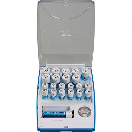 Micro- und Mignon-Batterien sind die am häufigsten benötigten Batterien – sie stecken in Fernbedienungen, in Wetterstationen, in Digitalkameras und in unzähligen anderen elektronischen Geräten. Sichern Sie sich mit dem BATTERIE-ORGANISIERER einen ausreichenden Vorrat von hochwertigen Alkali-Batterien (insgesamt 22 Stück) – denn der nächste Ausfall lässt garantiert nicht lange auf sich warten! In der praktischen Kunststoffbox bleiben alle Batterien geordnet beisammen. Zusatznutzen: Über die eingebaute Teststation können Sie jede beliebige Micro-/Mignon-Batterie auf ihren Ladezustand prüfen. Maße (L x B x H): ca. 14 x 10 x 6 cm. Besser, man hat vorgesorgt!