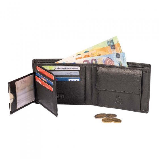 Büffelleder ist nicht nur extrem robust, sondern auch optisch eigenständig, denn es wird von Wasserbüffeln gewonnen – und deren Haut ist viel grobnarbiger als die Haut von Rindern. Kein Wunder, dass das Material insbesondere bei Männern sehr beliebt ist. Die Büffelleder-Geldbörse vereint den kernigen Look dieser Lederart mit einem durchdachten Fächerkonzept (sie hat u. a. 8 Kartenfächer und 5 Einsteckfächer, zwei davon mit transparenter Kunststoffabdeckung) und modernem RFID-Schutz. Besonders praktisch ist das „Schnellzugriff“-Kartenfach für die wichtigste Karte. Maße (B x L x T): ca. 10 x 13 x 2 cm. Sie möchten eine Geldbörse, die ewig hält? Entscheiden Sie sich für diese!