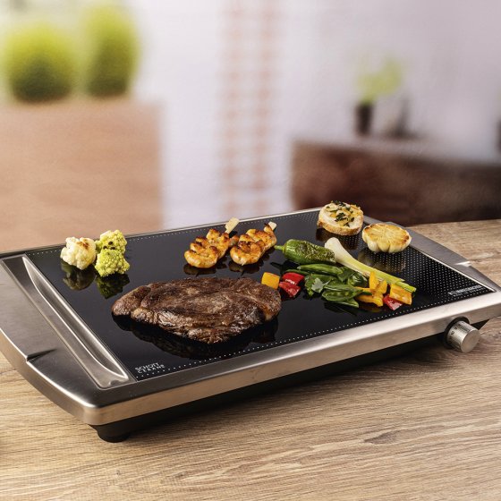 - Betrieb über 230 V Original SCHOTT Ceran® Grillfläche mit Warmhaltezone hochwertiges Edelstahl Gehäuse, geschliffen und gebürstet
