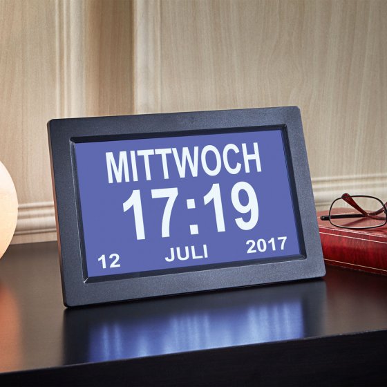 Sie wollen auf einen Blick alles sehen – Uhrzeit, Wochentag und Kalenderdatum? Bitteschön: Die DIGITAL-UHR MIT TAGESZEITANZEIGE präsentiert Ihnen in hellen Ziffern und Buchstaben auf einem spiegelfreien Backlight-Display die Zeichen der Zeit – wie auf einem Tablet. Es stehen 3 Darstellungsformate zur Wahl. Darunter eines, das gänzlich auf Ziffern verzichtet und die Tageszeit komplett in Worten anzeigt (in einer von 7 einstellbaren Sprachen, alle Wörter sind voll ausgeschrieben). Betrieb über 230 V mit 5-V-Netzadapter (inklusive). Maße (B x H x T): ca. 24 x 16 x 2 cm. Klarer lässt sich die Zeit nicht anzeigen!