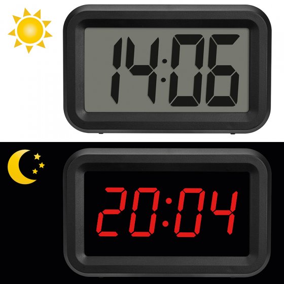 Der DIGITALWECKER „HYBRID“ bringt Sie morgens nicht nur rechtzeitig aus dem Bett – dank des hybriden Displays mit LCD- und LED-Anzeige haben Sie sowohl bei Tageslicht als auch im Dunkeln die Uhrzeit immer im Blick. So müssen Sie sich nicht zwischen herkömmlichem Display mit schwarzen Zahlen oder rot leuchtenden LED-Ziffern entscheiden, sondern Ihnen stehen je nach Geschmack oder Tageszeit beide Varianten offen. Die Umschaltung erfolgt automatisch über einen Lichtsensor, alternativ können Sie auch manuell zwischen den beiden Anzeige-Möglichkeiten wechseln. Zusätzlich verfügen die LED-Leuchtziffern über eine Dimmfunktion mit zwei Helligkeitsstufen. Betrieb über 4 Mignon-Batterien (separat erhältlich). Maße (B x H x T): ca. 13 x 8 x 4 cm. Und die integrierte Snooze-Funktion verschafft Ihnen morgens ein paar zusätzliche Minuten vor dem Aufstehen.