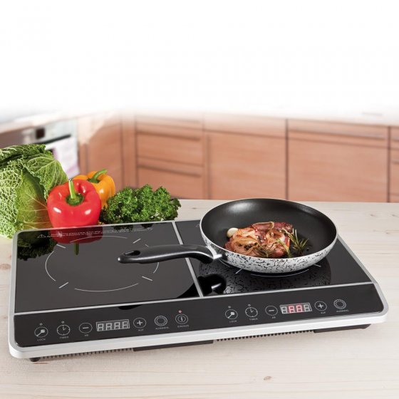 Die bewährte DOPPEL-INDUKTIONS-KOCHPLATTE ist jetzt noch komfortabler! Die neuen Touch-Bedienungspunkte lassen sich leichter bedienen als jemals zuvor – und sorgen jetzt für noch mehr Freude am Kochen! Ihnen stehen 2 separat bedienbare, großzügige Kochfelder aus pflegeleichtem, robustem Qualitätsglas zu Verfügung. Da bei dieser hochmodernen Art des Kochens nur das leitfähige Kochgeschirr erhitzt wird, sparen Sie bis zu 50% Zeit und Energie! Das Kochfeld wird dabei nur indirekt warm. Ihr Vorteil: Übergelaufenes kann so gut wie nicht anbrennen, es besteht ein geringeres Verbrennungsrisiko bei Berührung – und Ihre Haushaltskasse freut sich! Maße ca. 60 x 35 cm, 230 V. Auch hervorragend für Garten und Camping – Testen Sie es!