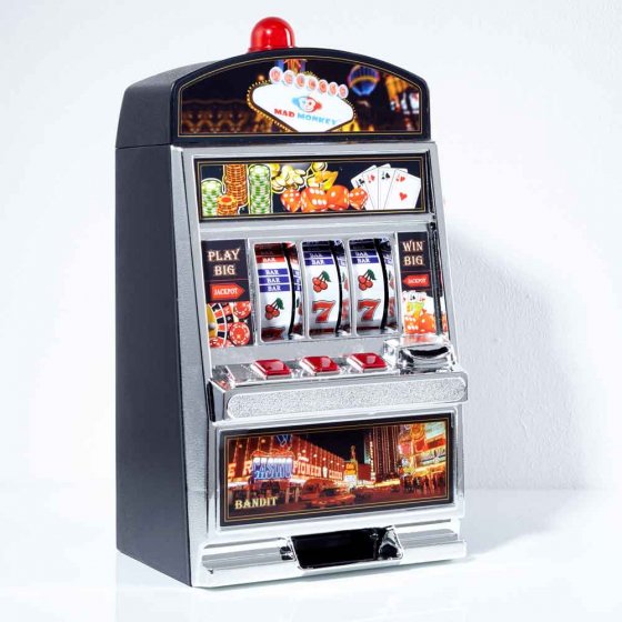 Sie sind bis heute ein Klassiker unter den Spielautomaten: die berühmten „einarmigen Banditen“. Der Name rührt von dem seitlichen Hebel – oder Arm – her, mit dem die Gewinnspiel-Walzen in Rotation versetzt werden. Der EINARMIGE BANDIT für den Hausgebrauch funktioniert wie seine großen Brüder in Las Vegas: Bleiben alle 3 Walzen so stehen, dass die richtigen Symbole in der Mitte erscheinen, ist das Spiel gewonnen. Und alle Münzen, die sich im Spielfach befinden, werden ausgeschüttet! Betrieb über 2 Mignon-Batterien (separat erhältlich). Maße (B x H x T): ca. 20 x 38 x 15 cm. Mit zusätzlichem Spardosen-Fach (Einwurf rückseitig). Holen Sie sich einen Casino-Klassiker ins Wohnzimmer!