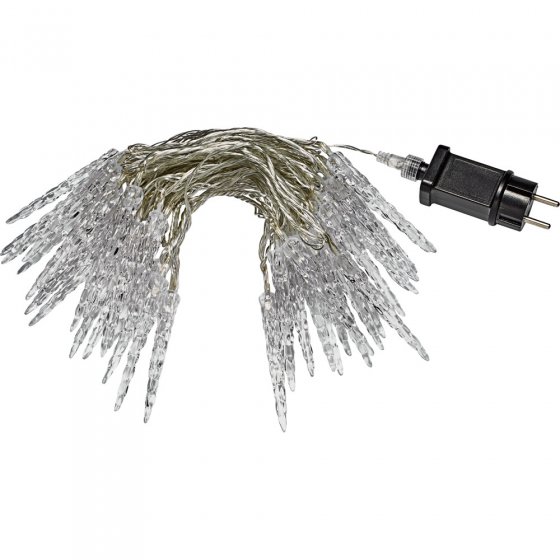 Bei jedem Wetter funkelnde Eiszapfen rund ums Haus? Mit dieser verlängerbaren EISZAPFENLICHTERKETTE zaubern Sie zu Weihnachten Ihr eigenes „Winterwonderland“. Die 40 Eiszapfen aus transparentem Acryl sind jeweils etwa 10 cm lang und ziehen mit ihrem Strahlen alle Blicke auf sich. Sie sind auf einer beachtlichen Länge von 5,85 m mit je 15 cm Abstand verteilt und bieten viele kreative Anbringungsmöglichkeiten im und am Haus. Und wenn das nicht reicht: Die Lichterkette kann mit 2 weiteren Exemplaren verbunden werden und so bis zu 120 leuchtende Eiszapfen vereinen. Betrieb über einen 230-V-Netzstecker. Länge Lichterkette: 5,85 m + 5 Meter Zuleitung. Ihre Nachbarn werden staunen!
