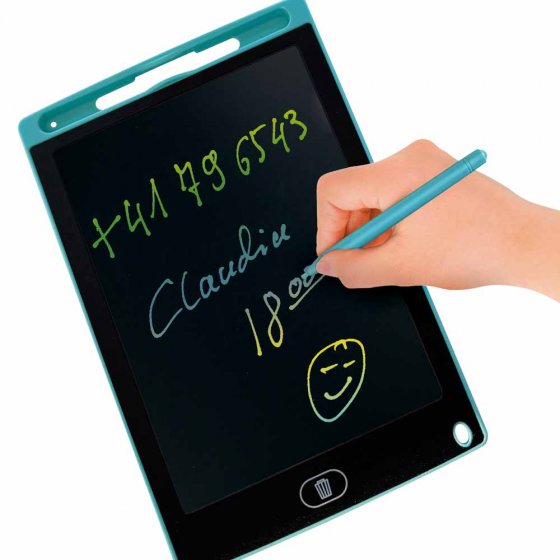 „Mal doch mal was!“ – auf diese Anregung hin werden Kinder gerne kreativ. Oft ist dann aber kein Papier im Haus, oder es gibt keine funktionierenden Buntstifte. Die ELEKTRONISCHE FARB-SCHREIBTAFEL macht Papier und Farben überflüssig: Mit dem zugehörigen Stift können kleine (und auch große) Künstlerinnen und Künstler darauf herrlich bunte Motive entstehen lassen; die Colorierung erfolgt automatisch! Dank der abnehmbaren Halterung kann die Tafel überall aufgestellt werden, alternativ ist auch eine Fixierung z. B. am Kühlschrank mit den mitgelieferten Magnetstreifen möglich. Maße (L x B x T): ca. 23 x 15 x 0,5 cm. Betrieb über eine Knopfzelle (inkl.) Selbstverständlich können Sie auch mit dieser Tafel Ihre Notizen, Einkaufszettel oder Erinnerungen schnell und einfach aufschreiben!