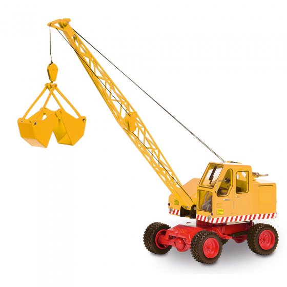 Der FUCHS BAGGER 301 zählt zweifellos zu den bekanntesten deutschen Baugeräten. Kein Wunder: Gebaut ab 1957, tat er bis weit in die 80er-Jahre hinein auf den Baustellen des Landes seinen Dienst – und selbst heute ist er noch auf einigen Schrottplätzen im Einsatz. Über 15.000 Exemplare wurden gebaut. Das 1:32-Modell aus Zinkdruckguss hat eine drehbare Kanzel und einen ca. 23 cm langen beweglichen Ausleger; das Auslegerseil lässt sich per Drehkurbel (hinter dem Führerhaus) ein- und ausrollen. Der Schaufelgreifer kann gegen eine Abrissbirne getauscht werden. Maße (L x B x H): ca. 11 x 8 x 8 cm (ohne Ausleger). Umfasst Ihre Sammlung bislang nur Autos oder Traktoren? Dann wird es Zeit für Ihren ersten Bagger-Oldtimer!