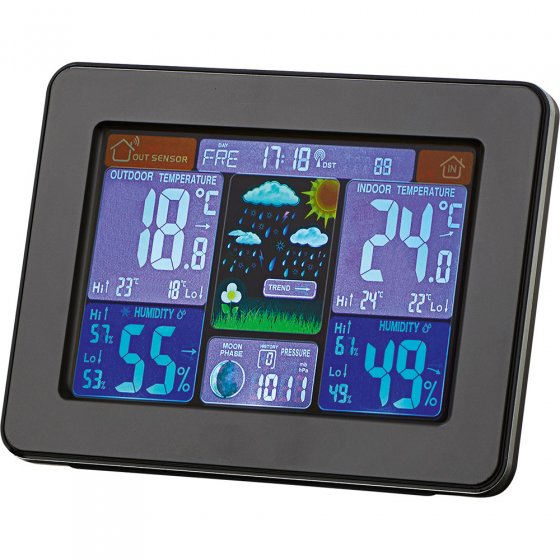 Kann der Regenschirm zuhause bleiben? Ein Blick auf die FUNK-WETTERSTATION verrät es! Die animierte Wettervorhersage zeigt auf 12 Stunden zuverlässig, worauf Sie sich einstellen sollten. Neben der Innen- und Außentemperatur zeigt das große, farbige LED-Display weitere nützliche Informationen wie Uhrzeit, Luftfeuchtigkeit oder Mondphasen an. Dank Memory-Funktion, die alle Daten speichert, haben Sie das Wetter auch langfristig im Blick. Zusätzlich warnt der integrierte Alarm vor extremen Temperaturen! Betrieb über Netzteil oder insgesamt 4 Mignon-Batterien (beides mitgeliefert). Maße Station (B x H x T): ca. 16 x 12 x 5 cm. Auf diesen „Wetterfrosch“ ist Verlass!