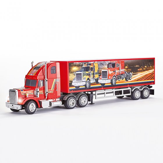 Welcher Mann oder Junge träumt nicht davon, in einem XXL-Truck die Highways zu erobern und grenzenlose Freiheit zu genießen? Mit dem extralangen FUNKGESTEUERTEN JUMBO-TRUCK wird dieser Traum auch in der Heimat möglich. Erleben Sie, wie der Truck sich in Bewegung setzt und die Frontscheinwerfer während der Fahrt aufleuchten. Das 70 cm lange Kraftpaket im Maßstab 1:20 fährt vorwärts, rückwärts, links und rechts. Der Auflieger ist abnehmbar und sogar die Heckklappen können geöffnet werden. Maße (L x B x H): ca. 70 x 12 x 20 cm (inkl. Anhänger). Betrieb über eine 9 V-Blockbatterie und 5 Mignon-Batterien (separat erhältlich). Starten Sie den Truck und gehen Sie auf große Fahrt!