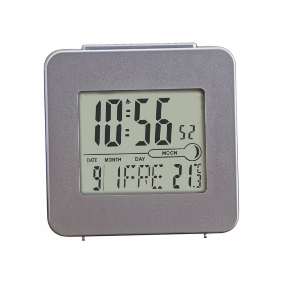 Dieser neue Funkwecker empfängt über das DCF-77- Funksignal aus Frankfurt die präziseste aller Zeiten. Große und gut zu erkennende Wiedergabe der Zeit auf dem LC-Display, vervollständigt durch zusätzliche Anzeige des Datums, des Wochentages, der Raumtemperatur und dem Stand des Mondes. Maße des Kunststoffgehäuses (L x B x H): ca. 8 x 2,5 x 8 cm. Betrieb über 2 Micro-Batterien (separat erhältlich). Alarmfunktion mit Weckwiederholung und zuschaltbare blaue Hintergrundbeleuchtung. Ein wirklich exklusives Zeitmessinstrument, mit dem Sie in Zukunft den günstigsten Tag etwa für das Umtopfen von Pflanzen oder für einen Friseurtermin nicht mehr verpassen werden.