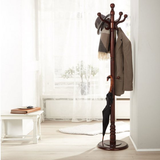 Was sehen Ihre Gäste als Erstes im Flur, der Visitenkarte Ihres Heims? Die Ablage für Mäntel, Jacken und Kopfbedeckungen! Setzen Sie mit unserem freistehenden GARDEROBENSTÄNDER „MAHAGONI“ auf einen wahren Klassiker. Seine gebogene, mit gedrechselten Knäufen versehene Krone ist ein eindrucksvoller Blickfang. Sie eignet sich sehr gut als Hutständer, auf halber Höhe befinden sich Haken für Regenschirme. Material: Birkenholz, lackiert, in Mahagoni-Optik. Maße: Höhe ca. 180 cm, Standfuß (Ø) ca. 40 cm. Leichte Selbstmontage. Heißen Sie Ihre Besucher stilvoll willkommen!
