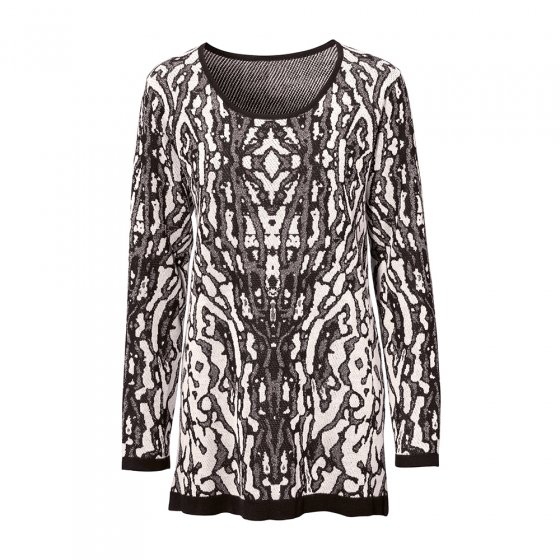 Der bildschöne Jacquard-Strick ist dezent mit silbrig schimmernden Glanzfäden durchzogen: Das gibt diesem hochkomfortablen Pullover eine luxuriöse und modische Note. Er ist perfekt für Tag und Abend, einmalig angenehm zu tragen und durch die leicht taillierte, hüftbedeckende Form einfach super für eine schlanke Silhouette! Schmale unifarbene Abschlüsse in Schwarz an Hals, Arm und Saum. Weicher, tragefreundlicher Strick aus 85 % Viskose, 15 % metallischen Fasern.