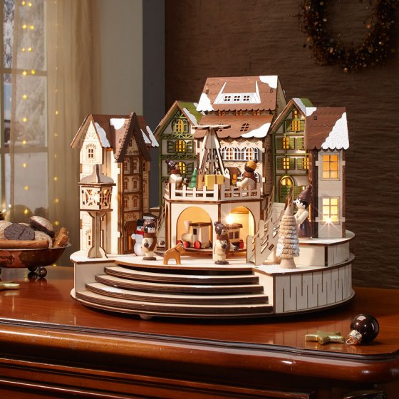 An dunklen Wintertagen leuchtet das GROSSE LICHTERDORF warm und wohlig, wie man es aus den schönsten Märchen kennt! Glitzernde Schneestellen bedecken die Dächer, während sich die Weihnachtspyramide in der Mitte des zauberhaften Dorfplatzes dreht. Durch die Fenster fällt warmes Licht – gespendet von 7 integrierten LEDs. Die kleinen Treppen verleihen der Szenerie besonderen Charme und verbinden die detailreichen Ebenen miteinander. Maße (L x B x H): ca. 30 x 30 x 26 cm. Betrieb über Netzanschluss (Netzteil im Lieferumfang enthalten) oder 3 AA-Mignon-Batterien (separat erhältlich). Dieses Lichterdorf bringt ein Stück Weihnachtsfrieden zu Ihnen!