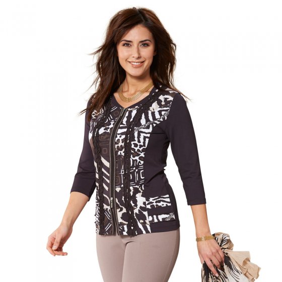 Modisch und ladylike zugleich wirkt der Cardigan mit effektvollen Druckmotiven im Ethno-Look und schmalen Rüschendetails. Unifarbene Seitenpassen in Dunkelbraun bilden einen reizvollen Kontrast dazu und zaubern eine deutlich schlankere Silhouette! Traumhaft angenehm zu tragen ist die hautsympathische, elastische Jerseyqualität. Ein weiteres Highlight ist der praktische 2-Wege-Reißverschluss. Abgerundeter Halsausschnitt, beliebter ¾-Arm, figurgünstige Hüftlänge. 95 % Viskose, 5 % Elasthan.