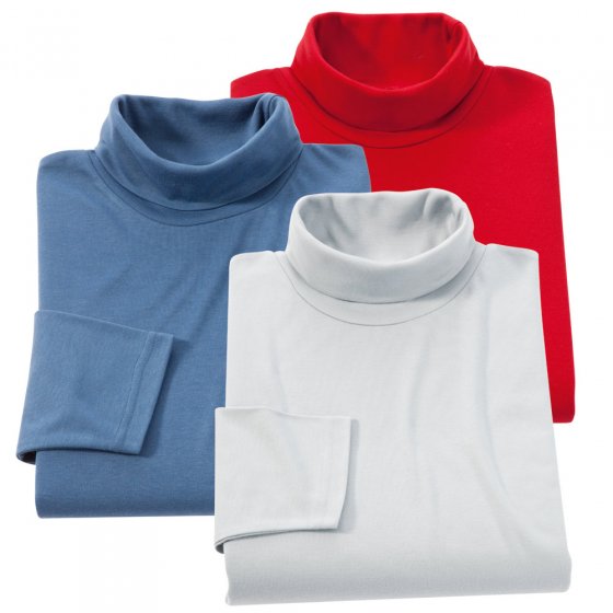 Diese superbequemen Jersey-Rollishirts im Dreier-Pack sind ideal zum Unterziehen, aber eigentlich viel zu schön, um sie unter Sakko, Hemd oder Strickjacke zu verstecken! In kombistarkem Rot, Blau und Silbergrau sind sie auch sportlich-elegante „Einzelgänger“ zu sämtlichen Hosen und Jeans. Das hautsympathische Jersey-Material in Interlock-Qualität ist einmalig körperfreundlich, von sich aus bewegungselastisch und hoch formbeständig. Es vermittelt angenehme Wärme und ist ausgesprochen knitterarm und pflegeleicht. Sehr gepflegter Schnitt ohne auftragende Bündchen, 65 % Polyester, 35 % Baumwolle, maschinenwaschbar. Bestellen Sie sich unseren Sparpack zum Vorteilspreis, und Sie sind für die kalte Jahreszeit ausgestattet!