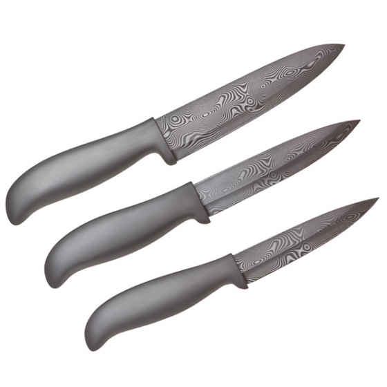 Ihr edler Damast-Effekt erinnert an Klingen aus dem berühmten Damaszener Stahl. Doch dieses designstarke KERAMIKMESSERSET „DAMAST“ bietet gegenüber Stahlmessern entscheidende Vorteile. Die Schneiden sind aus hochwertiger, schwarzer Zirkonia- Keramik, einem Material, das aus der Weltraumtechnik stammt. Sie wurden unter hohem Druck gepresst, sind fast so hart wie ein Diamant und leichter als Stahl. Sie bleiben viel länger scharf und haben eine besonders glatte Oberfläche. Daher gleiten sie mühelos durch das Schneidgut, ohne dass etwas daran haften bleibt. Sie rosten nicht, sind geschmacksneutral und hygienisch. Die ergonomischen Griffe aus stoßfestem ABS mit rutschsicherer Kautschukummantelung liegen ausgezeichnet in der Hand und gestatten ein langes, ermüdungsfreies Schneiden. Das Set umfasst 3 Messer mit Klingenlängen von ca. 16, 13 und 10 cm, damit Sie zum Schneiden, Filetieren, Schälen und Zerkleinern stets das Richtige zur Hand haben. Ein Messer-Set der Spitzenklasse, das Sie lange Jahre begleiten wird, ohne seine Schneidkraft und seine Eleganz einzubüßen!