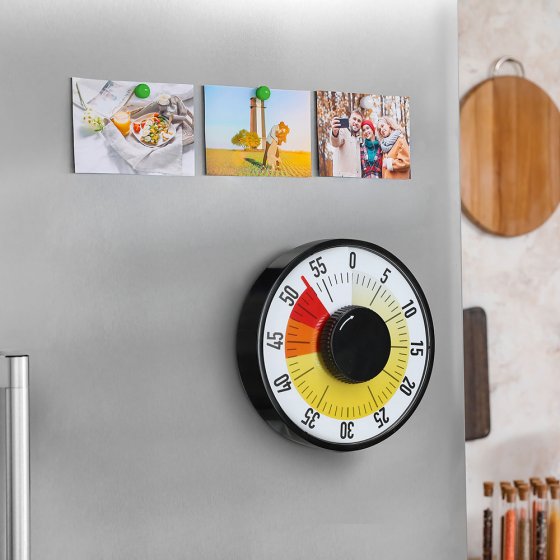 Vermissen Sie auch die aufziehbare „Eieruhr“ aus früheren Zeiten, die man, wenn der Kuchen im Ofen war, überallhin mitnehmen konnte? Der KURZZEITMESSER XXL ist eine neue Version davon! Er arbeitet wie gehabt rein mechanisch, und sein akustisches Signal nach Ablauf der eingestellten Zeit ist nicht zu überhören. Dank einer Farbskala auf dem Display (gelb, orange, rot) sehen Sie auf den ersten Blick, wie viel Zeit (50, 10 oder 5 Minuten) ungefähr noch bleibt. Maße: Ø ca. 16 cm, Gehäusestärke ca. 5 cm. Mit Aufhängeöse, rückseitigem Magneten und abklappbarer Stütze zum Aufstellen. Behalten Sie diesen Zeitwächter immer in Ihrer Nähe – dann verpassen Sie garantiert keinen Fristablauf!