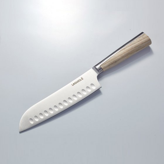 Normalerweise findet man hochwertige Laguiole-Messer in Hosentaschen – doch dieses ultra-scharfe LAGUIOLE-SANTOKUMESSER leistet in der Küche Großes! Die 17 cm lange Klinge mit eingeschliffenen Kullen – länglichen Vertiefungen oberhalb der Messerschneide – eignet sich perfekt für die Zubereitung von Fleisch, Fisch und Gemüse. Nichts bleibt an der Edelstahl-Klinge haften, egal, wie dünn Sie die Scheiben schneiden! Der auffällige Erl, der die Griffschale aus Eschenholz komplett durchzieht, macht das Messer zu einem echten Hingucker und balanciert es optimal aus. Maße (L x B x H): ca. 30 x 2 x 5 cm. Gewicht: ca. 185 g. Auch ein tolles Geschenk, wenn Sie bei Freunden zum Essen eigeladen sind!