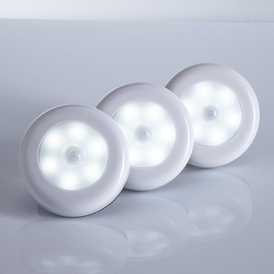 Mit dem Spätsommer nähern sich auch die ersten trüben Herbsttage mit großen Schritten. Damit dunkle Ecken dann nicht zur Stolperfalle werden, sorgen die LED-Leuchten im 3er-Set für gute Lichtbedingungen – ganz ohne Strom. Die batteriebetriebenen Leuchten mit sensiblem Bewegungssensor sind überall flexibel einsetzbar. Selbst tückischste Treppenstufen und tiefe Schränke werden, dank 5 heller und stromsparender LED-Lichter pro Leuchte, optimal erhellt. Maße (H x Ø): ca. 2 x 6,8 cm. Einfache Anbringung ohne Bohren. Für ein gemütliches und sicheres Zuhause.