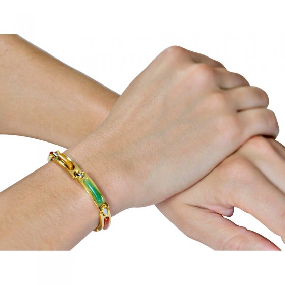 Dieses Magnetarmand mit Schmucksteinen hat ein Geheimnis: Es verbirgt fünf Magnete mit jeweils ca. 1.000 Gauß. Zugleich schmückt das Armband Ihr Handgelenk mit seinem vergoldeten Metall und fünf polierten Schmucksteinen: roter Onyx, Tigerauge, Aventurin, Mineraltürkis und Gold-Sandstein. Die Länge von ca. 20 cm kann durch Heraustrennen einzelner Glieder individuell angepasst werden. Nicht geeignet für Schwangere und Herzschrittmacherträger.