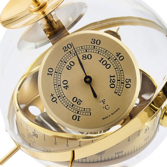 Viel interessanter als elektronische Varianten und doch genauso präzise: Diese MECHANISCHE WETTERSTATION gibt faszinierende Einblicke in die feinmechanische Arbeitsweise eines offenen Barometerwerkes. Inspiriert durch die legendäre russische Weltraumsonde „Sputnik“, erfreut dieses echte Meisterwerk nicht nur mit präzisen Daten, sondern auch durch seine zeitlose Eleganz. Die transparente und drehbare Kugel aus Plexiglas thront auf einem Ständer aus Messing und beherbergt in ihrem Innern die 3 hochwertigen Messinstrumente Baro-, Hygro- und Thermometer. Maße: Ø ca. 13 cm, Höhe: ca. 20 cm. Gewicht: ca. 650 g. Ein besonderer Blickfang aus deutscher Produktion!