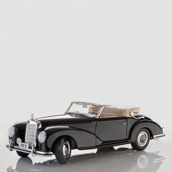 Diese Kult-Karosse des deutschen Wirtschaftswunders steht für pures Open-Air-Fahrvergnügen: Der MERCEDES BENZ 300 S CABRIOLET aus dem Baujahr 1951! Intern W 188 genannt, ist der zweitürige Wagen seltener als der berühmte "Flügeltürer" 300 SL. Dieses Modell war der letzte PKW von Daimler-Benz, der noch auf einem eigenen Rahmen aufbaute. Die nachfolgenden Fahrzeugkonzepte hatten eine selbsttragende Karosserie (z.B. die Ponton-Modelle). Er begeisterte mit den Leistungen eines Sportwagens: 150 PS aus einem 3 Liter-Sechszylindermotor mit 3 Solex-Vergasern. Das aufwändig gefertigte Zinkdruckgussmodell im Maßstab 1:18 ist mit allen Details seinem hochkarätigen Vorbild nachempfunden. Lenkbare Vorderräder sowie Türen, Motorhaube und Kofferraum zum Öffnen. Jetzt ein erreichbarer Wunschtraum für engagierte Sammler und alle, die Benzin im Blut haben!