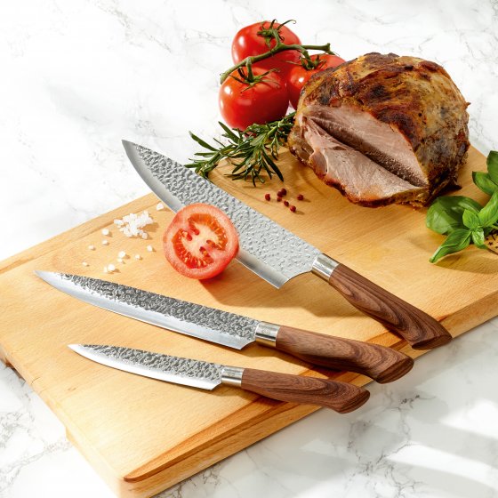 Unser edles MESSERSET „HAUTE CUISINE PARIS” trägt nicht umsonst diesen Namen. Denn für Menschen, die ans Kochen gehobene Ansprüche stellen, sind solche „Basis-Werkzeuge“ ein absolutes Muss. Beginnend mit dem Allzweckmesser und seiner 12 cm langen Edelstahlklinge, über das Tranchiermesser mit 20 cm Klingenlänge, bis zum sehr breiten Chefmesser (20 cm). Die Klingen sind beidseitig geschliffen und überzeugen neben enormer Härte vor allem mit außergewöhnlicher Schärfe. Sie wurden nach traditioneller Schmiedekunst gefertigt und sind dank des charakteristischen Hammerschlag-Musters ein echter Hingucker. An diesen Messern werden Sie lange Freude haben.