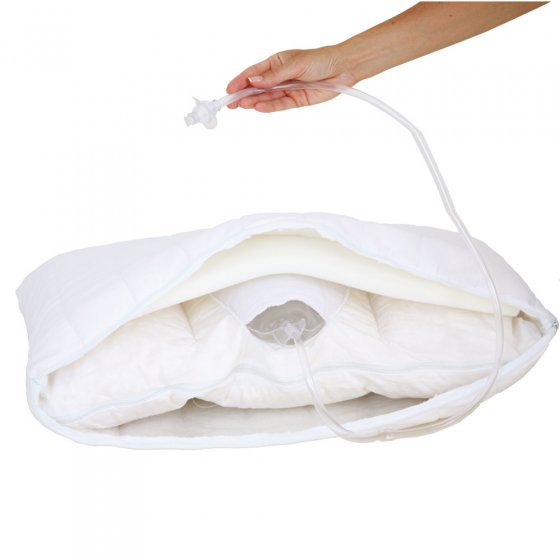 Lagebedingtes Schnarchen entsteht meist durch die Rückenlage, gefährdet die Gesundheit des Schnarchers und stört den Schlaf des Partners. Durch das neue Kissen wird der Schlafende auf sanfte Art und Weise zur Seitenlage animiert. Dadurch schnarchen ca. 82 % der Betroffenen weniger oder gar nicht mehr. Ganz einfach das integrierte kleine Luftkissen mit dem Mund auf die angenehme Liegehöhe aufpumpen. Bei Herausnahme des Luftkissens haben Sie ein bequemes, liegefreundliches Kissen, gefüllt mit 300 g Latexchips und Schaumstoffplatte. Bezug mit Reißverschluss aus 100% Microfaser, versteppt mit siliconisierter Polyester-Hohlfaser. Innenteil aus 100% Baumwollperkal. Maße ca. 35 x 70 cm.