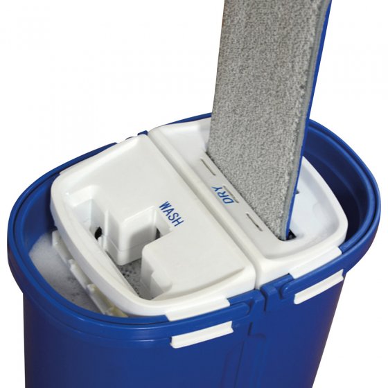 Fußboden säubern – das heißt normalerweise bücken und wringen. Vergessen Sie das! Das NASS-TROCKEN-WISCHSYSTEM, bestehend aus einem Doppeleimer (trennbar) und einem Wischmopp mit langem Stiel (132 cm), ermöglicht feuchte Bodenreinigung ohne Bücken. In der einen Eimerhälfte befeuchten Sie den Mopp, in der anderen wringen Sie ihn aus. Dank der Abstreif-Lippe im Eimeraufsatz können Sie die Hände dabei stets am Stiel behalten (und aufrecht stehen bleiben). Das beim Abstreifen austretende Wasser fließt automatisch in die Waschwasserhälfte. Eimervolumen: 2 x 7 l. Auslieferung inkl. zweier Mikrofaser-Wischmopptücher (je 33 x 13 cm). Schonen Sie Ihren Rücken – aber nicht den Schmutz auf Ihren Böden!