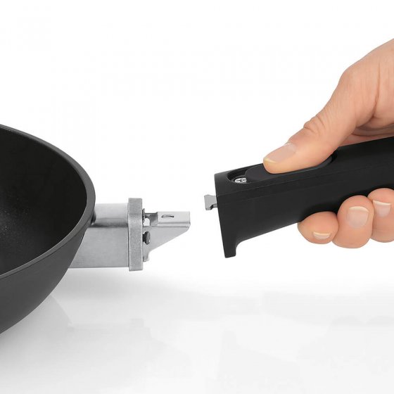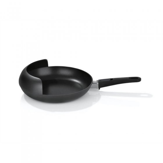 Haben Sie auch schon fasziniert dabei zugesehen, wie Fernsehköche allein durch Schwenken der Bratpfanne lässig Geschnetzeltes und Bratkartoffeln wendeten? Sie können das auch – mit der PFANNE MIT WENDESCHUTZ. Der Wendeschutz sorgt dabei nicht nur für den optimalen Drehimpuls, sondern verhindert auch jegliches Kleckern. Außerdem ermöglicht er sauberes Servieren von Tellerportionen. Die Pfanne ist aus geschmiedetem Aluminium und hat innen eine Antihaftbeschichtung. Der Kunststoffgriff ist abnehmbar – sie kann also auch als Auflaufform dienen. Durchmesser: ca. 28 cm. Geeignet für alle Herdarten. Wie man’s auch dreht und wendet: Diese Pfanne ist genial!