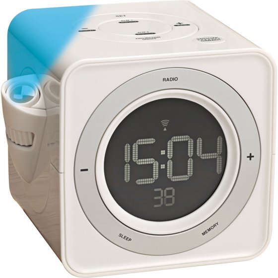 Nicht jeder schläft gern mit Armbanduhr am Arm – aber so gut wie jeder möchte beim Aufwachen wissen, wie spät es ist. Die Lösung: der PROJEKTIONS-RADIOWECKER. Er wirft die Uhrzeit mittels blau leuchtender Lichtprojektion groß an die Wand – oder an die Decke (die Projektionsleuchte ist drehbar gelagert). Dass die Zeit stimmt, ist garantiert: Die in den Wecker integrierte Uhr wird per Funk vom Zeitzeichensender DCF77 in Mainflingen angesteuert. Der Wecker enthält ein AM-/FM-Radio mit Senderspeicher; Sie können sich morgens also wahlweise mit einem Piepton oder mit Radio-Musik wecken lassen. Und wenn’s eine ganz bestimmte Musik sein soll, schließen Sie einfach Ihren MP3-Player an! Betrieb über Netzspannung (230 V), Netzteil inklusive. Back-up-Betrieb bei Stromausfall o. Ä. über 3 Micro-Batterien (separat erhältlich). Maße: ca. 10 x 10 x 10 cm. Sehen Sie künftig sofort nach dem Augenöffnen, was die Stunde geschlagen hat!