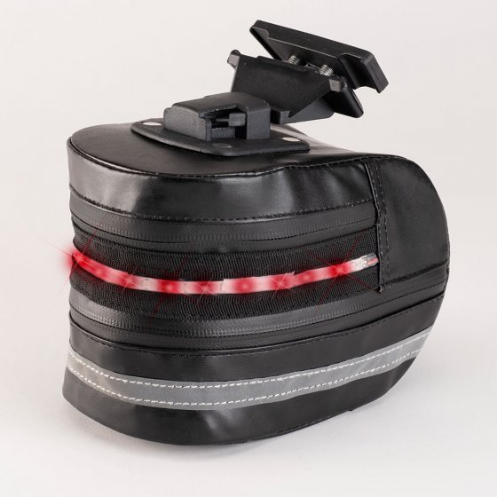 Freie Hosentaschen beim Fahrradfahren und das Wichtigste schnell griffbereit: Die praktische SATTELTASCHE MIT BELEUCHTUNG lässt sich per Schnellverschluss-Clip leicht anbringen und unterwegs abnehmen. Sie bietet ausreichend Platz für Handy, Schlüssel sowie Geldbeutel. Durch Öffnen des unteren Reißverschlusses kann das Volumen auf bis zu 1.3 L erweitert werden. Der Reißverschluss ist wasserabweisend geschützt, die zuschaltbare, rote LED-Beleuchtung mit 3 Modi sorgt für mehr Sicherheit durch bessere Sichtbarkeit im Straßenverkehr. Maße (B x H x T): ca. 11 x 11 x 19 cm. Aus strapazierfähigem 600D Polyestergewebe mit Reflektionsstreifen. Betrieb über 2 Knopfzellen (inklusive). Gehen Sie bequemer und sicherer auf große und kleine Touren!