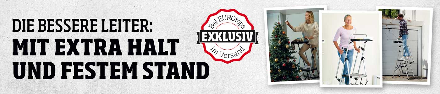 Diese Leiter hebt Ihre Sicherheit auf ein neues Niveau. Von EUROtops entwickelt, sorgt die TÜV-Rheinland geprüfte STAHL-SICHERHEITSLEITER 3-STUFIG sprichwörtlich mit jedem Tritt für ein völlig neues Sicherheitsgefühl. Die extra langen und griffigen Handläufe auf beiden Seiten bieten maximale Steig- und Trittsicherheit. Die vergrößerte Plattform bietet genug Platz für einen beidfüßigen, sicheren Stand. Der erhöhte Sicherheitsbügel und das ausklappbare Ablagetablett am Bügel erleichtern das Arbeiten in der Höhe. Der Abstand zwischen den extragroßen, rutschhemmenden Trittflächen (38 x 26 cm) ist so großzügig bemessen (24 cm), dass Sie beim Auf- und Absteigen nicht hängenbleiben. Das Highlight bilden die innovativen, geschützten Drehverschlüsse zur werkzeuglosen Arretierung der Handläufe. Maße (aufgestellt, H x B x T): ca. 162 x 47 x 76 cm. Material: robuste, 8,5 kg leichte Stahlkonstruktion. Gehen Sie im Alltag auf Nummer sicher mit der perfekt konzipierten Profi-Partner Aufstiegshilfe!