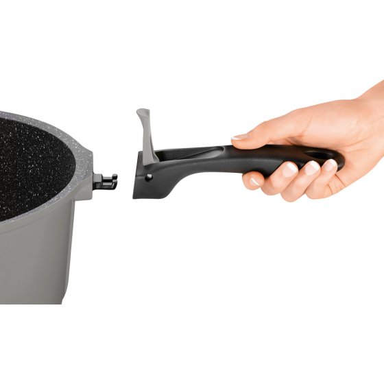 In Garküchen, in denen direkt auf Stein gebraten wird, kommt man praktisch ohne Fett aus. Das können Sie zu Hause auch haben: Jedes Gefäß des 8-teiligen STONELINE®-ALUGUSS-TOPF- UND -PFANNENSETS ist mit der extrem kratzbeständigen Stoneline®-Antihaft-Beschichtung versehen – kein Anbrennen, kein Ankleben! Besonderheit: Die Griffe sind abnehmbar und sogar austauschbar, daher kann jedes Gefäß auch in den Backofen gestellt werden (bis 220 °C). Material: Guss-Aluminium, Deckel aus Glas mit Silikonrand und Finger-Hitzeschutz. Geeignet für alle Herdarten einschließlich Induktion. Gesundes Kochen fängt mit dem richtigen Kochgeschirr an!