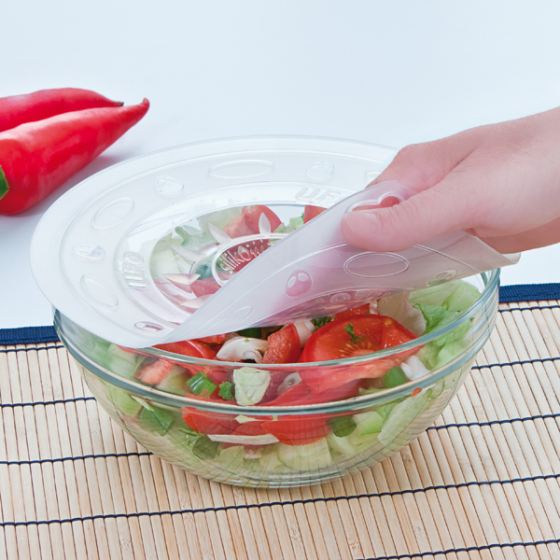 Wie Sie Ihre Salate, Nudelgerichte, Süßspeisen und Co. mühelos appetitlich frisch halten? Ganz einfach gleich in der Schüssel – mit den VAKUUM SILIKON-FRISCHHALTEDECKELN. Einfach über den Behälter legen, leicht in der Mitte drücken – fertig! Ein hermetisches Vakuum schont Ihre Speisen und schützt sie vor fremden Gerüchen. Dank der 3 patentierten Deckel (Maße ø ca. 21,5 / 25,5 / 29,5 cm) lassen sich Ihre Vorräte perfekt stapeln. Sogar in der Tiefkühltruhe – denn die vielseitigen Deckel vertragen Temperaturen von -60° C bis +230° C. Darum können Sie sie auch beim Kochen, Dämpfen, Braten genauso wie im Backofen und in der Mikrowelle benutzen! Geeignet für alle Materialien, hygienisch und spülmaschinenfest. Teure Frischhaltefolien können Sie sich in Zukunft sparen – Sie benötigen nur Ihr vorhan-denes Geschirr und die neuen superpraktischen Silikon-Deckel!
